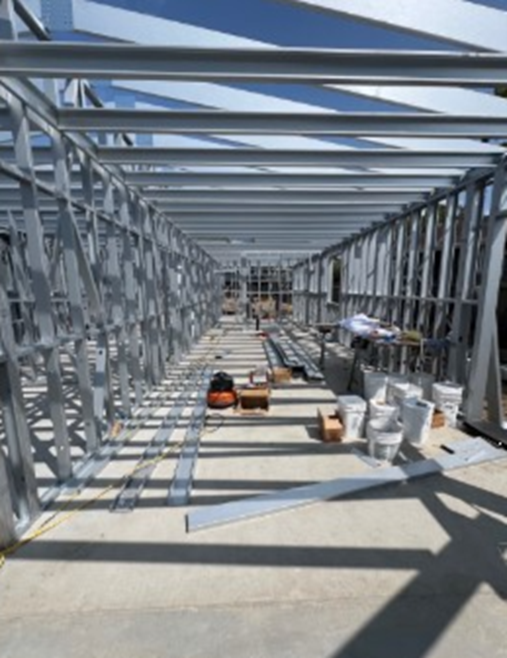 Steel structure was used for this project. The prefabricated structure with metal stud walls was fabricated in China and imported to the job site.