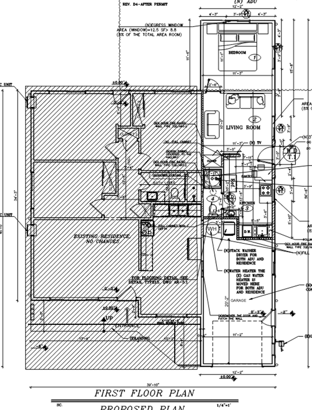 Description: A 860 sf ADU was designed in the existing 1st floor plan. The garage and 1st floor was converted to an ADU.